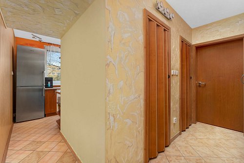 Velkou výhodou bytu je také vybavení na míru, které zůstává součástí prodeje. Najdete zde vestavěné skříně vyrobené na zakázku a další vybavení, díky kterému je možné byt využívat prakticky okamžitě bez dalších investic.